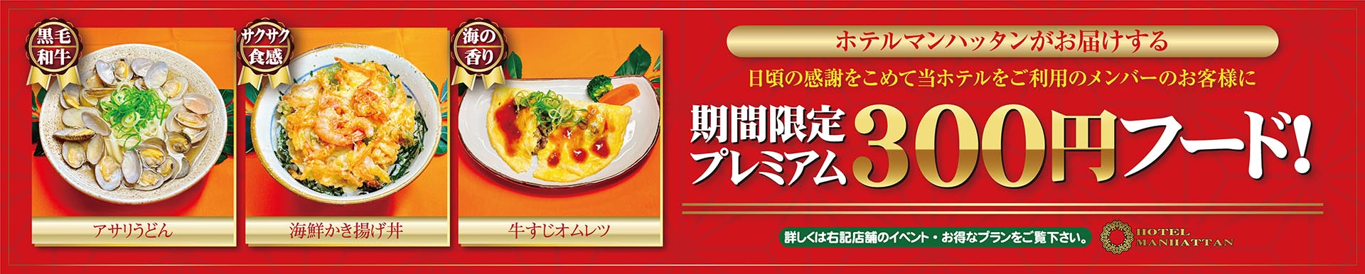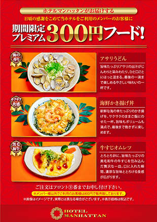 ●ご宿泊のお客様は100円フードor100円フード&スイーツより、お1人様1品ご利用頂けます。
